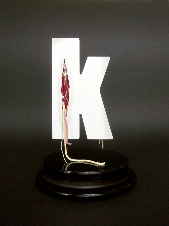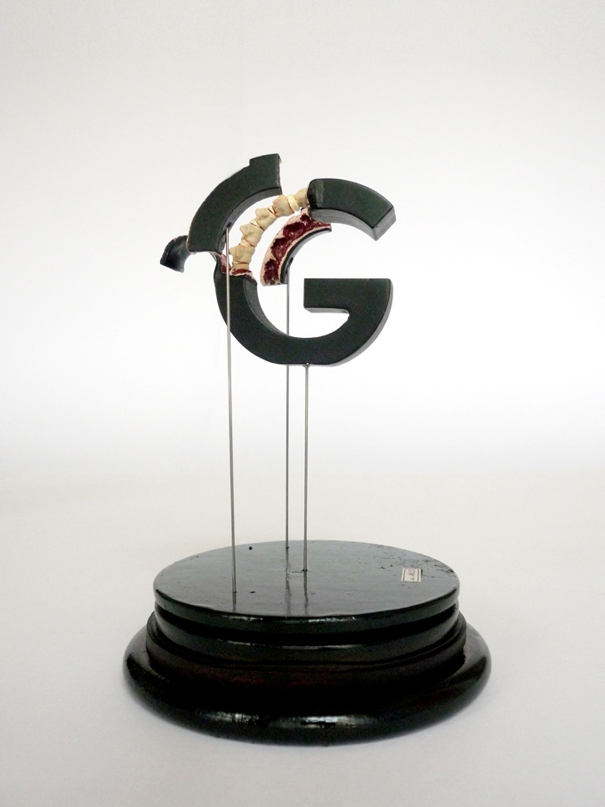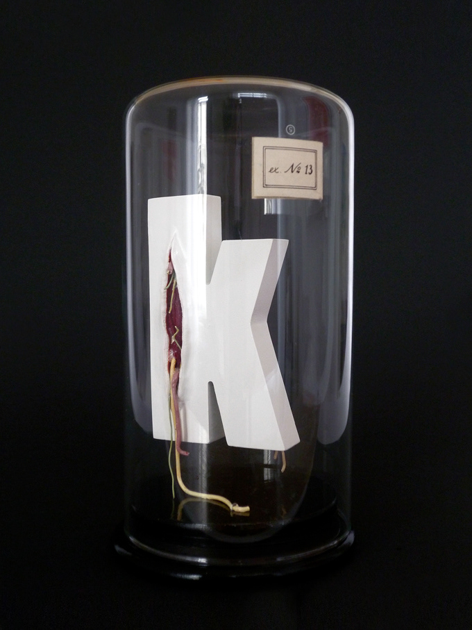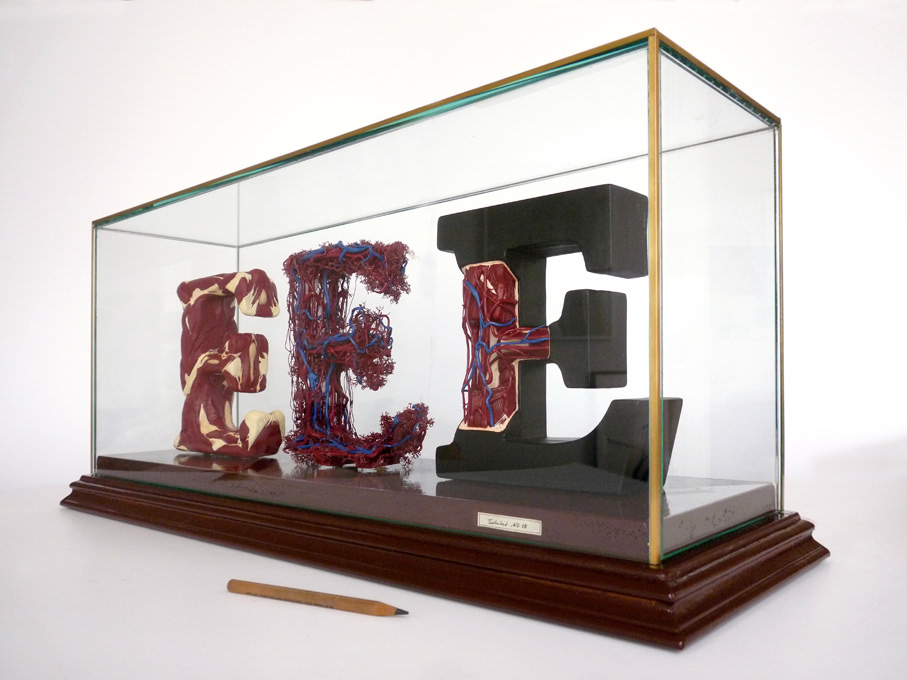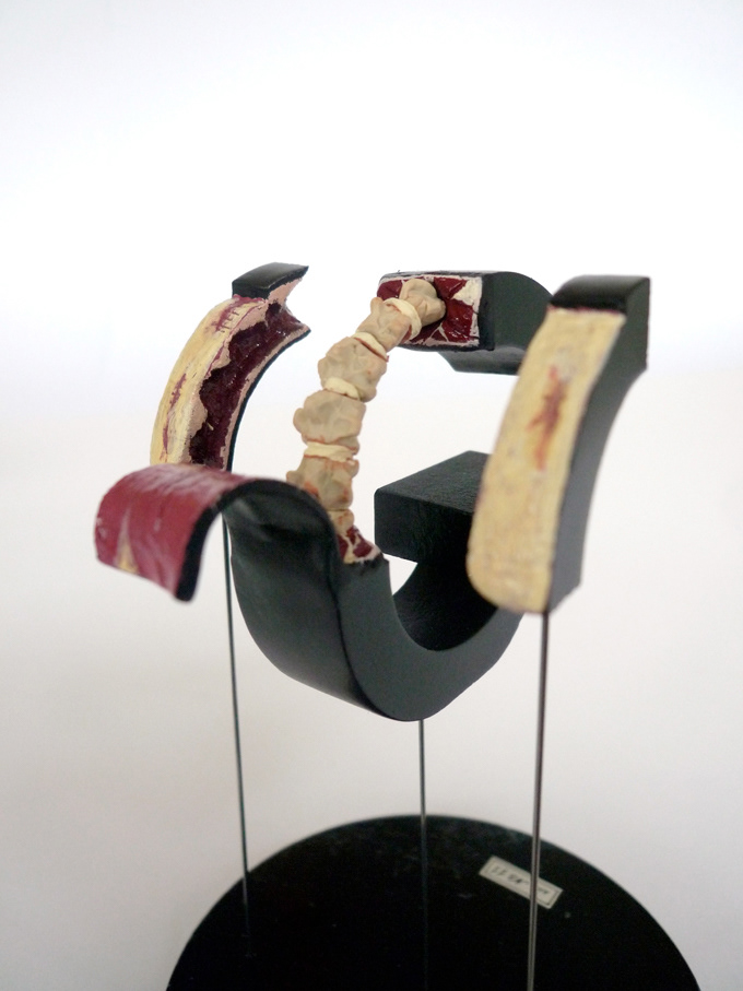 Materials used: Wood, polymer clay, chicken bones, wire, acrylics, clear varnish, glass casing.