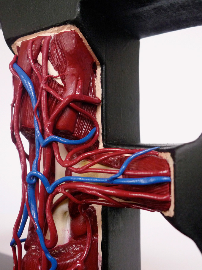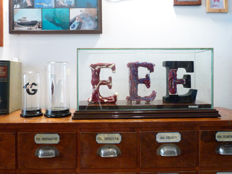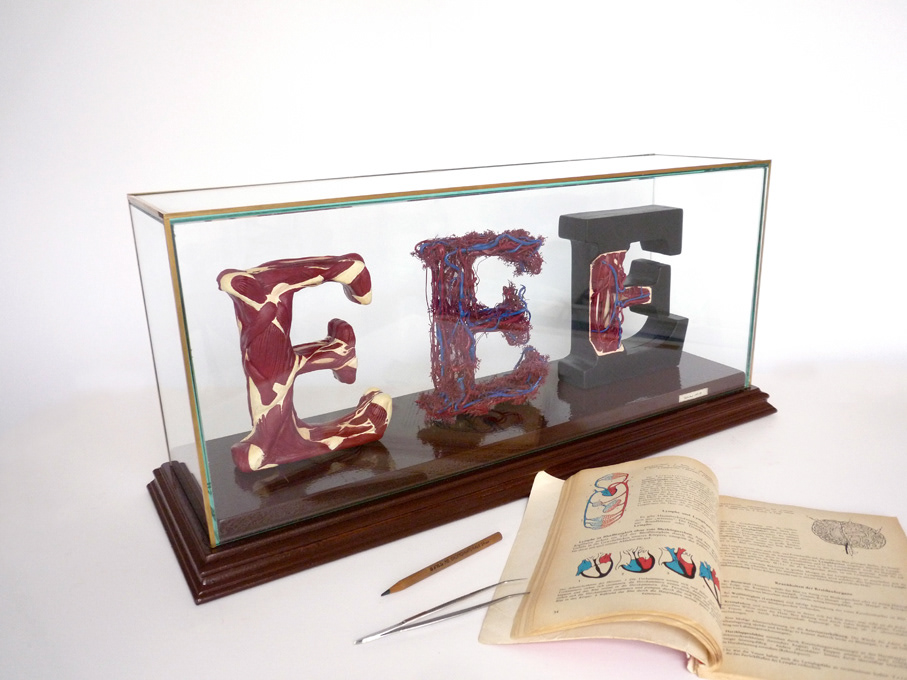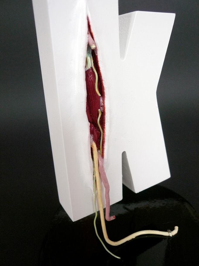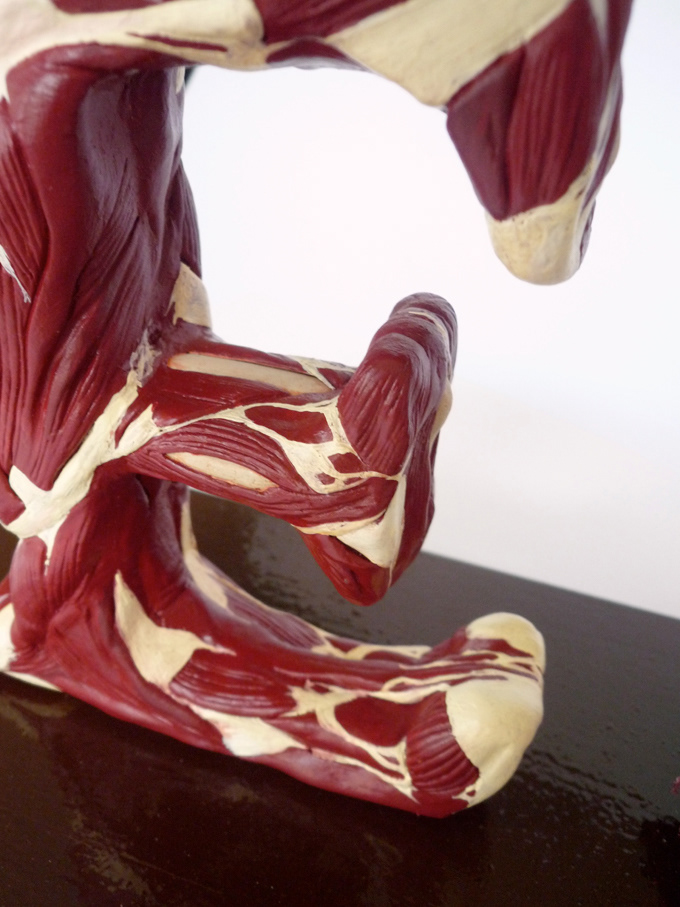 Materials used: Wood, polymer clay, chicken bones, wire, acrylics, clear varnish, glass casing.