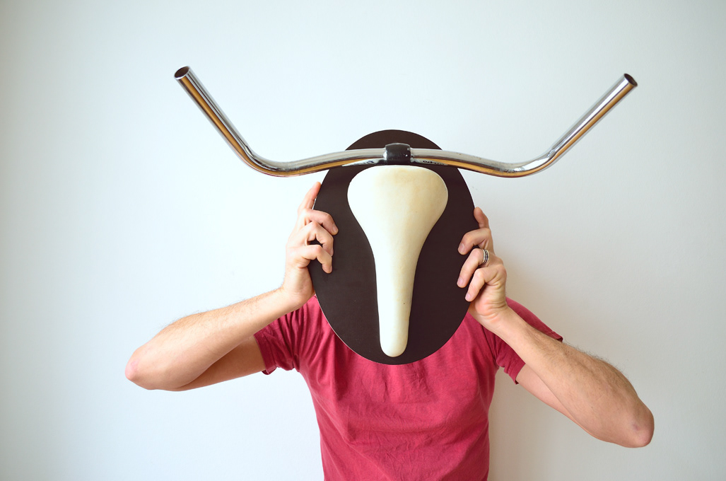 Materials: Used bicycle parts (saddles, stems, brakes, handle bars), wood plate, screws & nuts, brackets and strong bails.